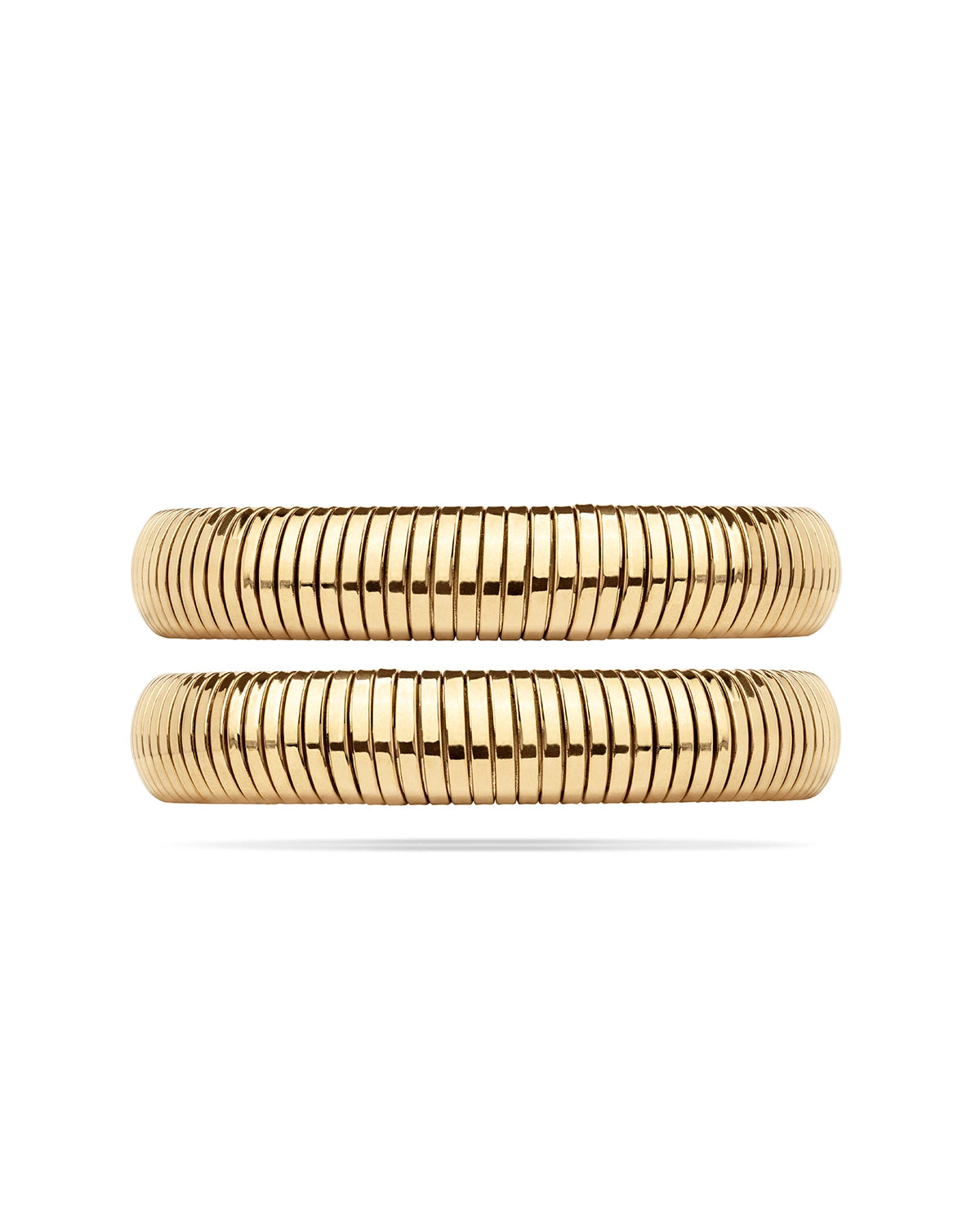 Two stainless steel bracelets with a ridged design – perfect to wear together or separately. Available in both gold and silver plating. Delivered together in a jewelry pouch.