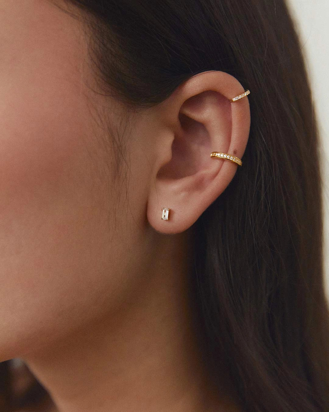 Long Stone Labret and Baguette Labret are sold individually, Stone Huggie Hoops 9 mm are sold as a pair. How to use labret: Insert the back part through the ear and screw on the front.
