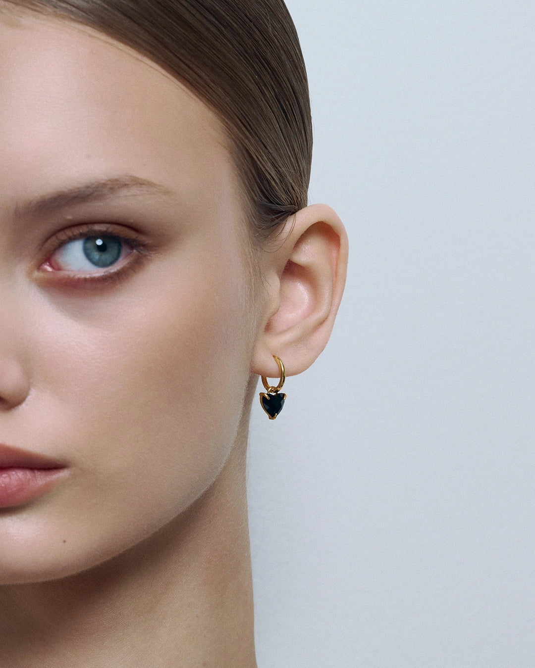 A pair of 9 mm huggies with a black heart charm. The charm is removable, so you can wear them with or without it. Delivered as a pair.