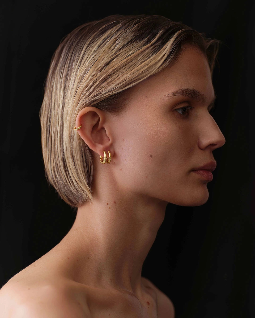 Sole Huggie Hoops, made from 100% recycled brass, feature a hammered surface that creates a distinct look. The earrings are sold in pairs and come in sizes 6 and 9 mm. Perfect for wearing on their own or stacked together for a more personalized expression.