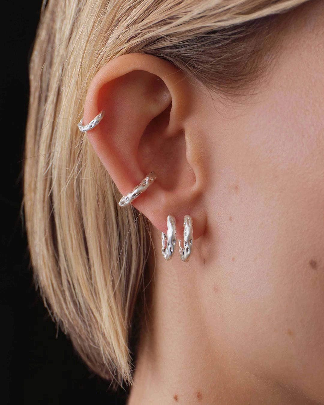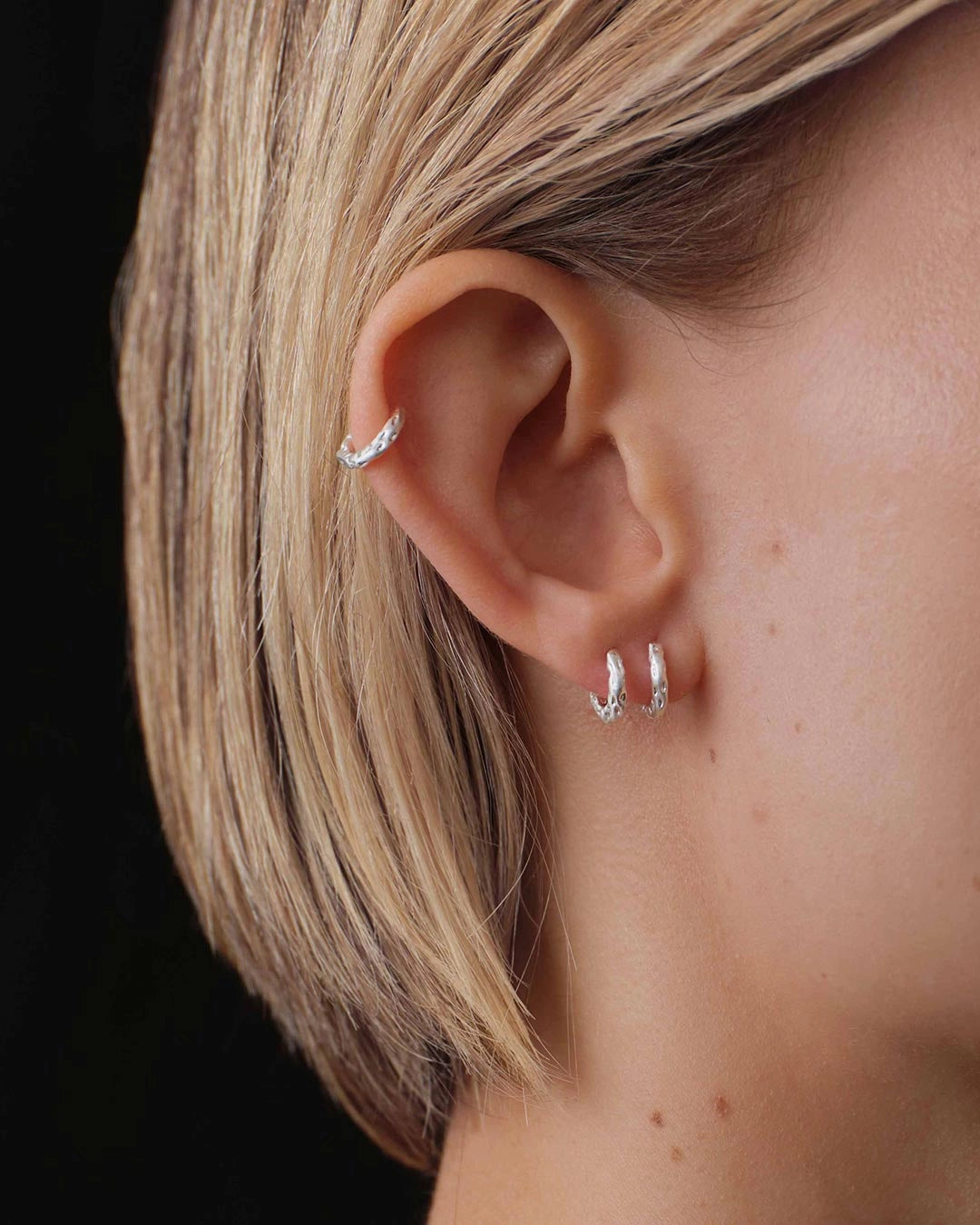 Sole Huggie Hoops, made from 100% recycled brass, feature a hammered surface that creates a distinct look. The earrings are sold in pairs and come in sizes 6 and 9 mm. Perfect for wearing on their own or stacked together for a more personalized expression.