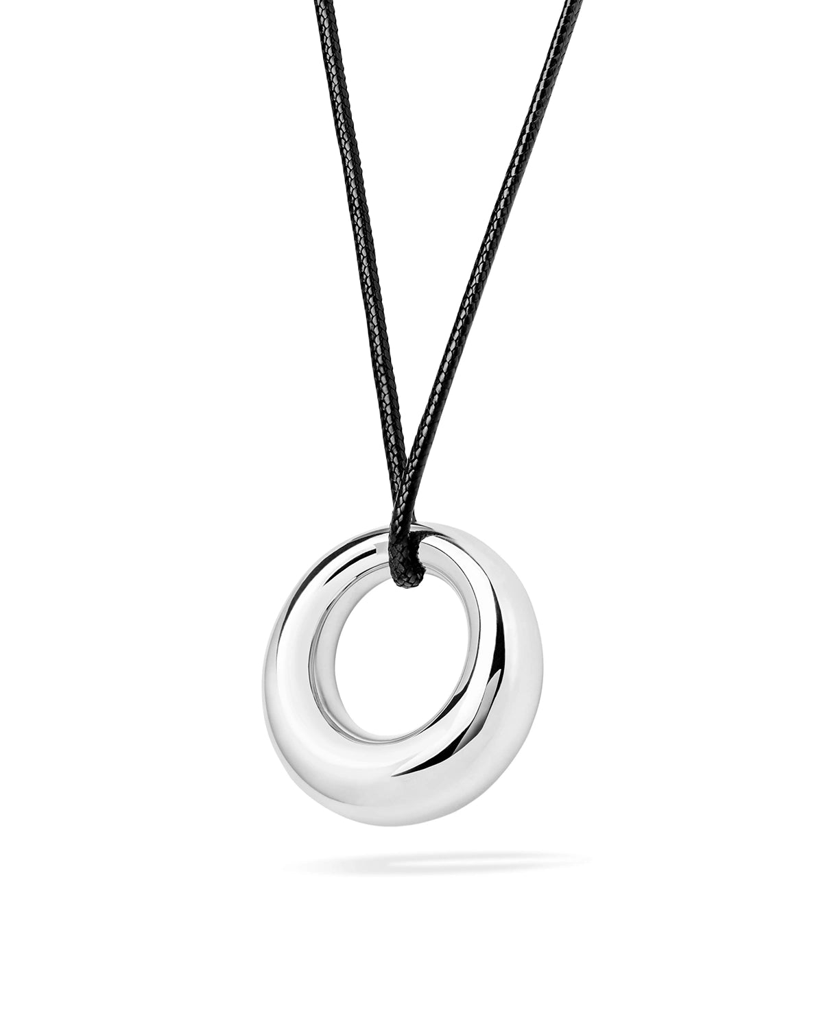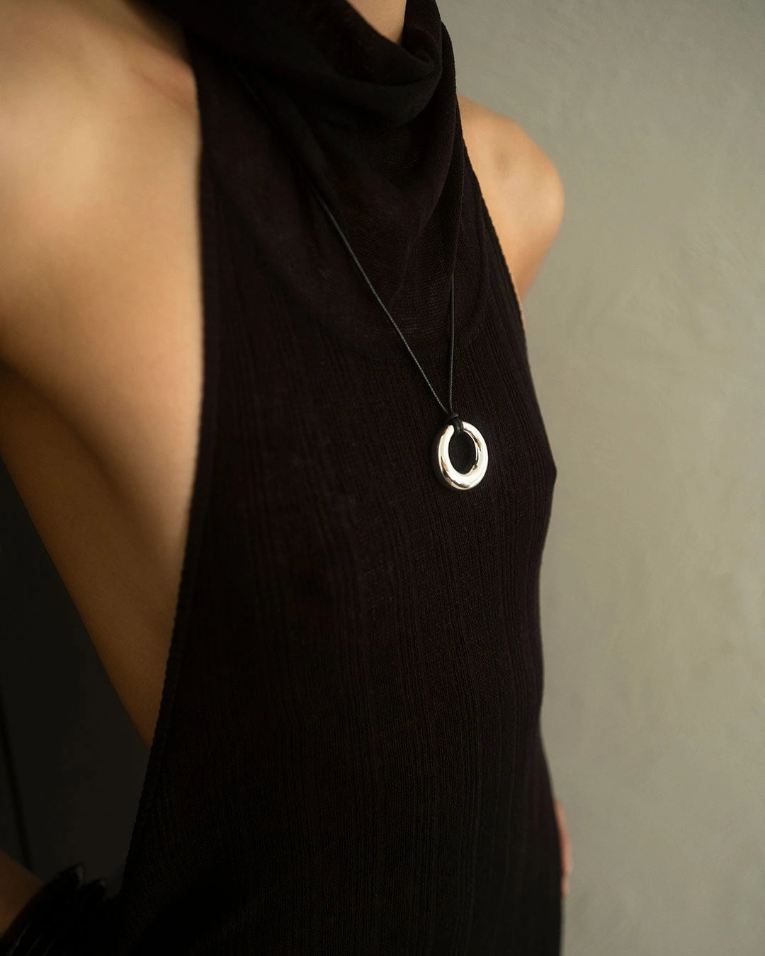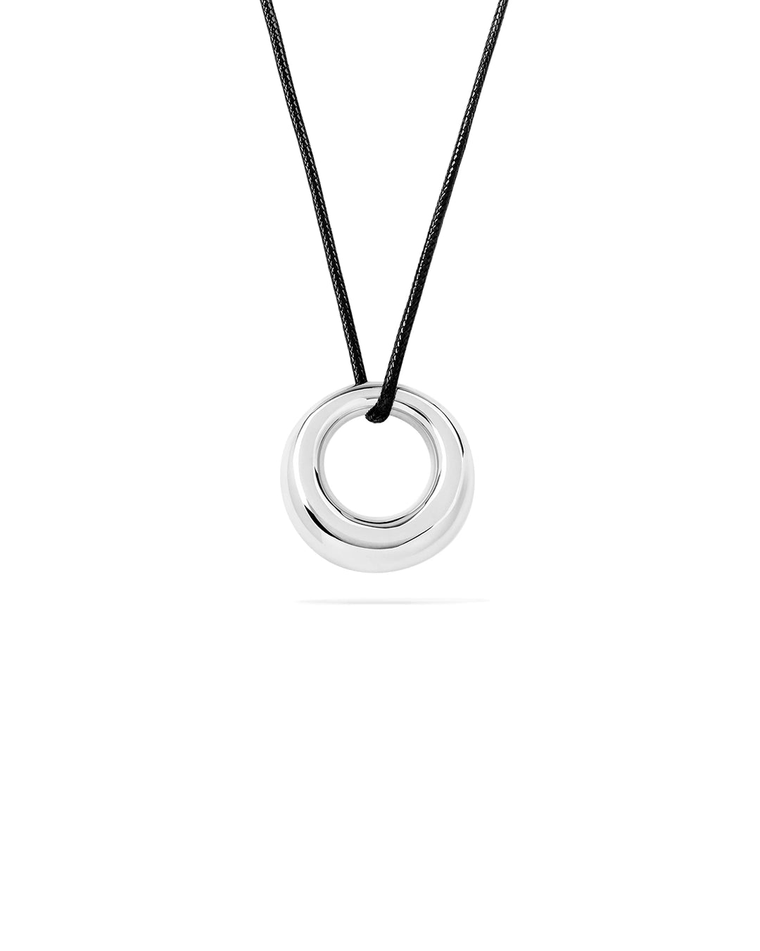 The Orbit Necklace is a necklace made from 100% recycled brass, featuring a shiny pendant available in both gold and silver. The necklace can be tied in different ways, making it easy to adjust to your style or the occasion you're wearing it for.
