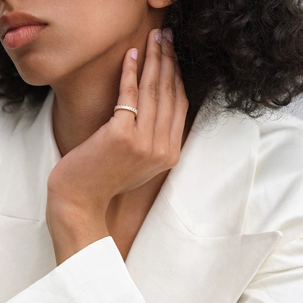 The perfect ring that is a must-have for your jewelry collection. With this ring you sparkle a little extra and stand out at the party. It comes in 18k gold plating or sterling silver, and the beautifully shimmering stones are white Cubic Zirconia. The exclusive design means that our Eternity Baguette Ring will be your new favorite for many years to come. The ring is delivered in a beautiful jewelry box which is perfect for storing your favorite jewelry, or when you want to give the ring as a gift.