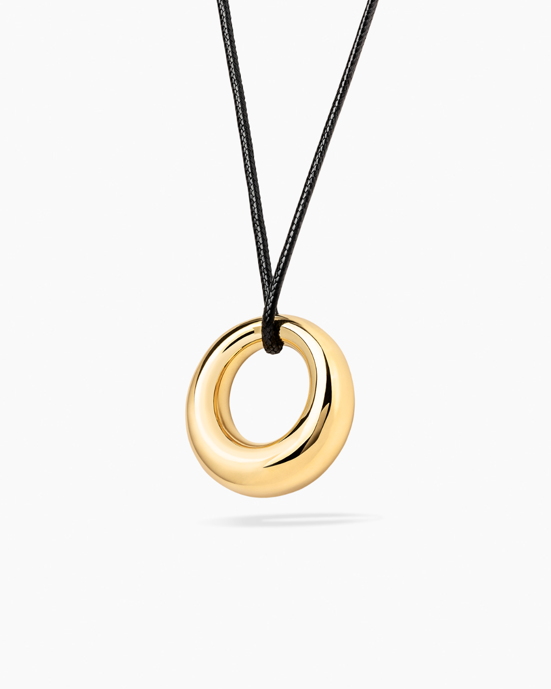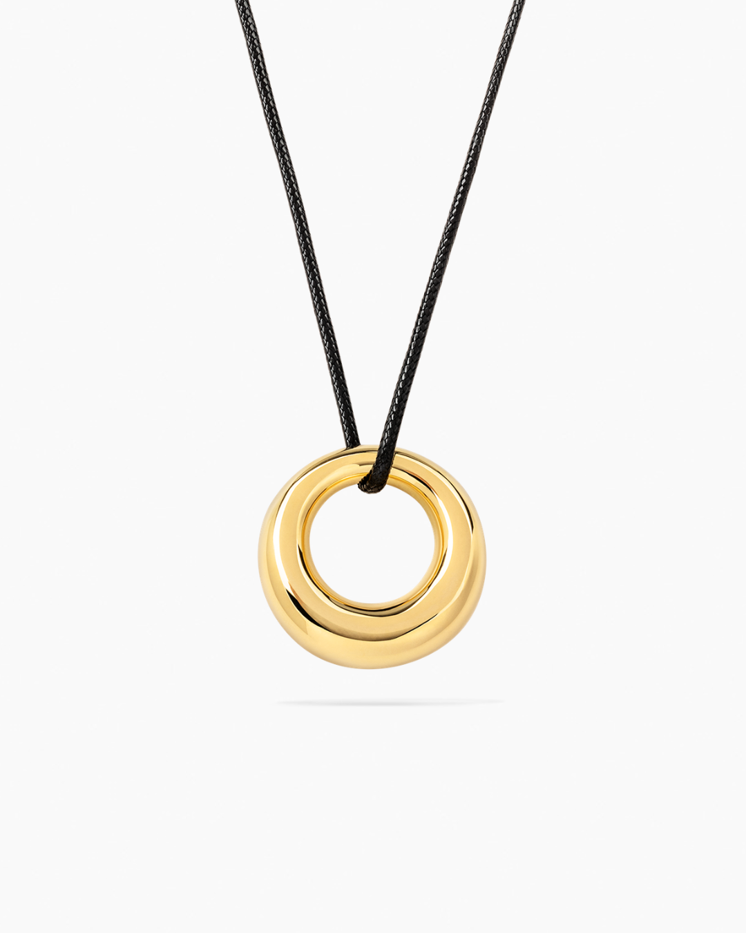 The Orbit Necklace is a necklace made from 100% recycled brass, featuring a shiny pendant available in both gold and silver. The necklace can be tied in different ways, making it easy to adjust to your style or the occasion you're wearing it for.