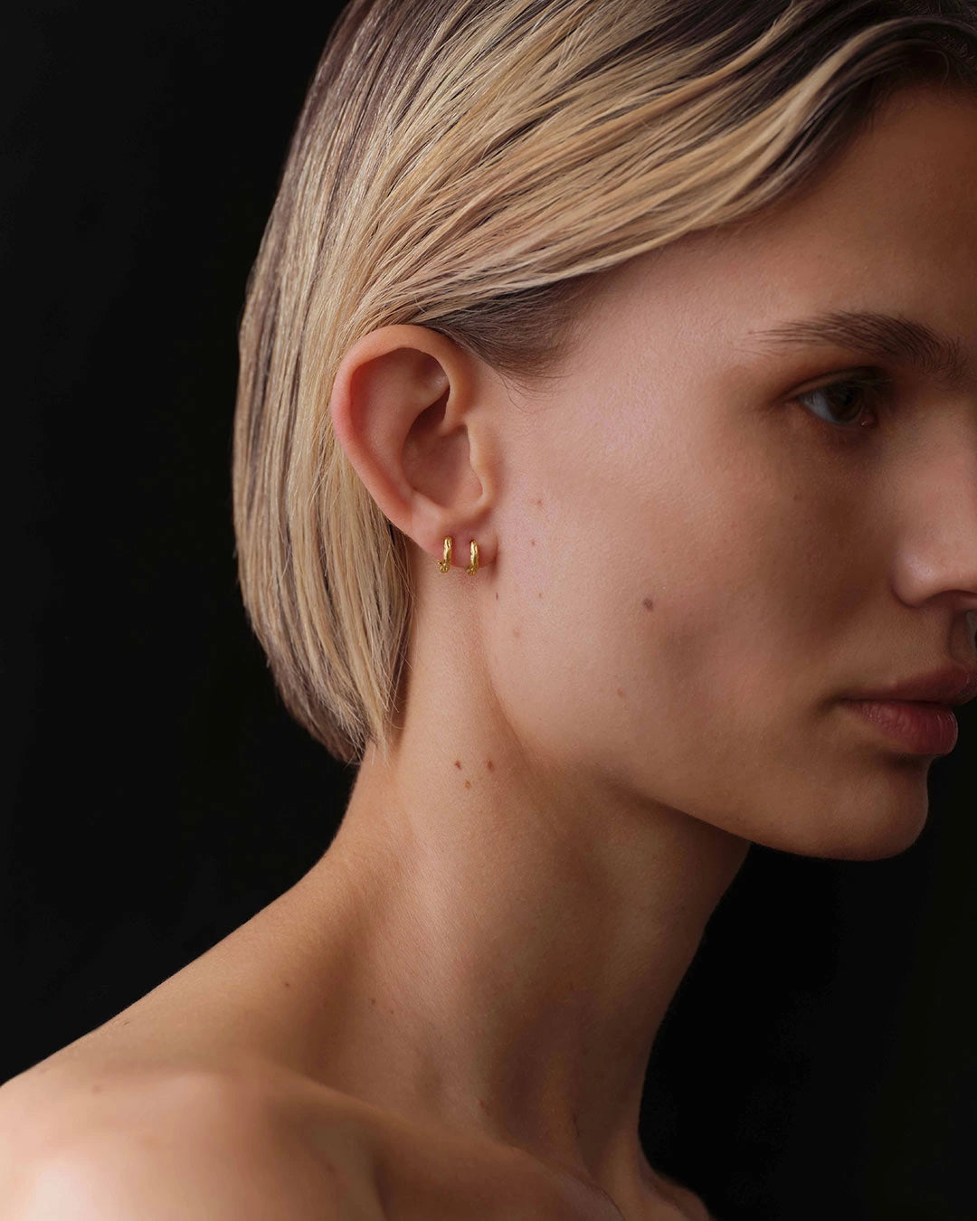 Sole Huggie Hoops, made from 100% recycled brass, feature a hammered surface that creates a distinct look. The earrings are sold in pairs and come in sizes 6 and 9 mm. Perfect for wearing on their own or stacked together for a more personalized expression.
