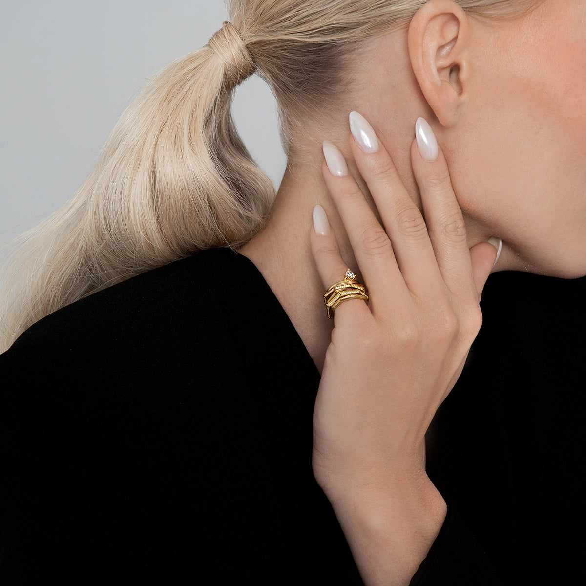 The perfect ring of which you never will tire. With an exclusive design, it has a timeless and elegant look. Choose your favorite in sterling silver or 18ct gold plating. The stones are white Cubic Zirconia. The ring is perfect for both every day and special events and is a nice gift for someone you care about. This piece is delivered in a beautiful jewelry box that is ideal when giving the ring as a gift or as storage for your favorite jewelry.