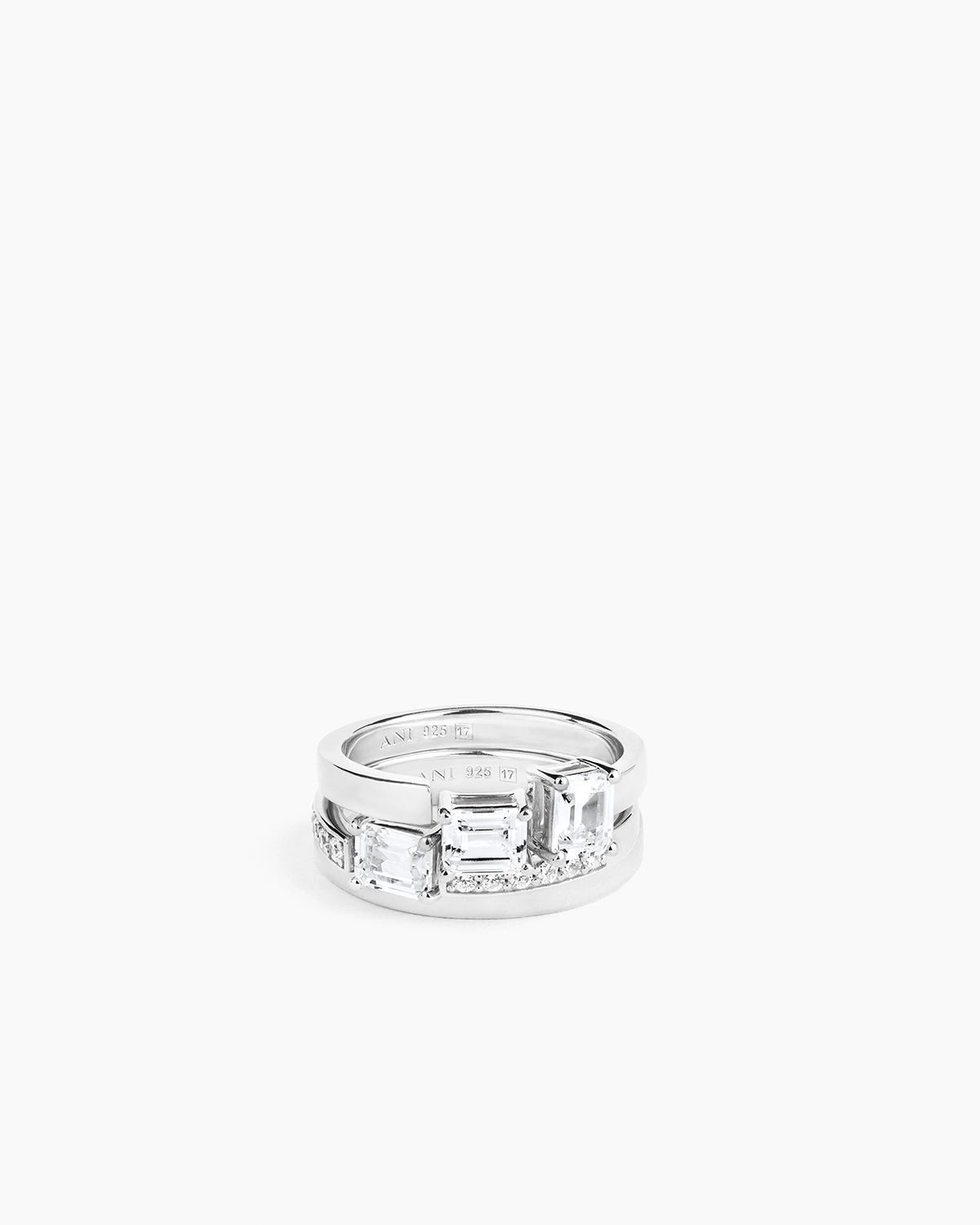 The Tris Emerald Kit includes three rings in genuine silver with sparkling cubic zirconia stones in emerald cut. The rings can be worn beautifully stacked together or on their own. Delivered in a beautiful ANI box.